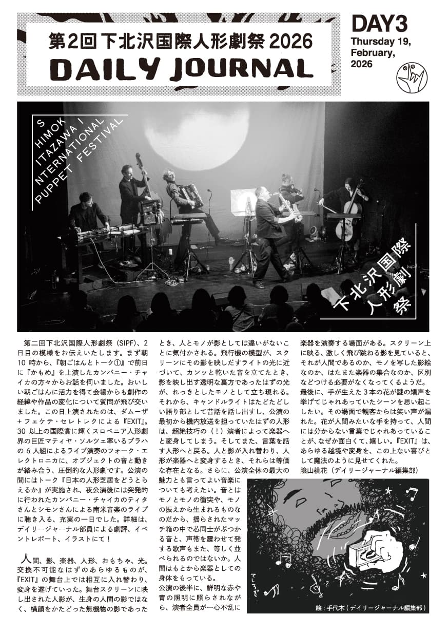 リソグラフスタジオHand Saw Pressが、下北沢国際人形劇際のフェスティバルセンター内に印刷スタジオを開設!選ばれしデイリージャーナル編集部員と共に、毎日公演やフェスティバルの様子を綴った新聞を作成して、印刷&配布します。